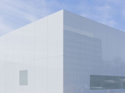 Creating a scenic overlook of Corning’s newly landscaped lawns, the glass façade integrates its natural setting, blending in with winter snow and floating above the green lawn in summer. Using a combination of TG-SAFEplus®, TG-PROTECTcolor® and TG-PRINTdigital®, Thiele Glas in Germany fabricated the 140 single, 3.20 × 7.20 meter panes to build a virtually seamless reflective surface. The North Wing’s exterior construction forms a unique composition of large laminated glass panes with vertical aluminum profiles that appear as a single unit, similar to the arrangement of an oversized showcase. The project combines Saflex DG structural interlayer with Vanceva Polar White opaque interlayer and digitally printed white dot matrix for a mix of transparent and translucent interlayers in each individual pane. The heavy 1,000-kilogram panes are held in place by aluminum profiles, which are bonded to the glass with silicone and mounted to the façade construction.